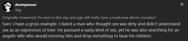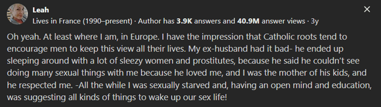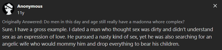 Într-un studiu efectuat la PennState College of Liberal Arts, aflăm că încă de la începutul secolului trecut, neurologistul austrian Sigmund Freud a observat felul contradictoriu în care bărbații se raportau la femeile din viața lor: cea care era dezirabilă nu putea fi iubită, iar cea pe care o iubeau devenea indezirabilă. Cu alte cuvinte, genul feminin era împărțit în două categorii foarte distincte: soțiile și mamele (care erau demne de iubire, dar neatrăgătoare) și amantele (care erau atrăgătoare, dar nu și demne de afecțiunie propriu-zisă). Freud credea, în stilul său tipic, că motivul din spatele unei astfel de gândiri ar fi relația avută în copilărie cu propria mamă. Dacă mama era văzută ca o figură perfectă și pură, atunci dorința sexuală proiectată pe o femeie o făcea „necurată”.
