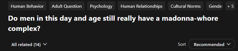 Acest tipar, încă predominant în sfera dating-ului contemporan, a primit denumirea de the Madonna-whore complex. Oximoronul alătură imaginea sfântă a figurii materne cu una dintre cele mai obscene jigniri atribuite genului feminin. Absurditatea fenomenului e ușor de observat: bărbatul care suferă de acest complex nu poate vedea o femeie ca fiind o persoană completă ce poate fi iubită și dorită în același timp. La fel ca strămoșii săi, el fie o pune pe un piedestal și o desexualizează, fie o dorește sexual și o disprețuiește. Asta duce inevitabil la un ciclu infinit de așteptări și dezamăgiri, atât pentru bărbați, cât și pentru femei. Plăcerea e înlocuită cu rușinea, iar conexiunea emoțională cu vinovăția.