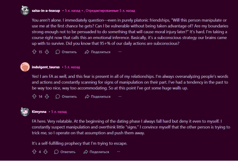 Părerea generală a femeilor poate fi ușor de intuit. Bunăoară, într-un forum de pe Quora găsim o doză bună de confesiuni vulnerabile lăsate de femei în poziții similare unde observăm cu ușurință gravitatea repercusiunilor acestui „război al sexelor”. Pe Reddit, lucrurile ne spun aceeași poveste. Problemele expuse variază de la caz particular la altul, dar, în esență, au puncte comune de pornire și sfârșit: „Nu vreau să mă îndrăgostesc de un bărbat indecis și indisponibili emoțional ca să pot evita anii de suferință și ședințele de terapie garantate cu greșeala asta” și „Am teama de a nu fi înlocuită cu altcineva, pentru că nu sunt capabilă de a satisface sexual un bărbat sau că sunt prea clingy cu el”.